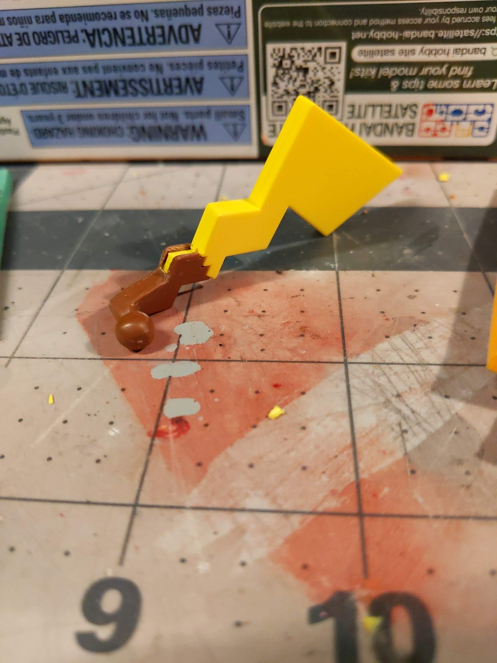 Here is an example where the same techniques were applied to fill in a section of the Pikachu tail that would normally be covered with a color correcting sticker. Instead it is filled in with the leftover brown runner that was cut to shape, cemented in place and sanded down to make it into one solid piece. Then using the seam filling technique to clean up any gaps and sanded smooth to match the finish.